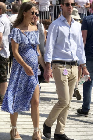 Pippa Middleton et son époux James Matthews ont été aperçus au Festival de vitesse de Goodwood, une course qui rassemble de nombreux véhicules de course historiques. Pour l'occasion, la petite sœur de Kate, probablement enceinte de 7 mois à cette époque, portait une robe fluide à encolure Bardot de couleur bleue et blanche.