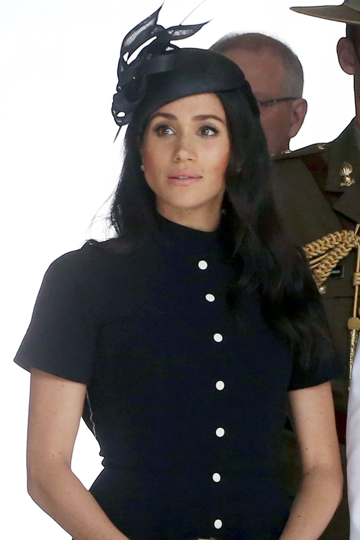 Meghan Markle a opté pour un style vintage et a choisi de porter une robe noire longueur midi et boutonnée sur le devant de la créatrice zélandaise Emilia Wickstead, ainsi qu'un bibi noir signé Philip Treacy. Une tenue élégante et confortable pour la future maman !