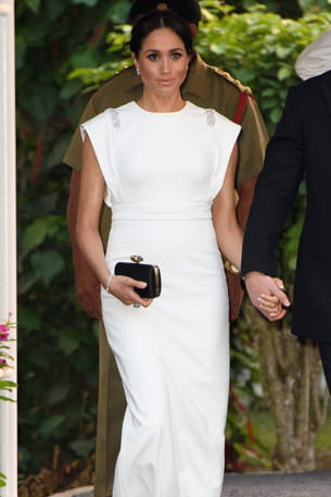 Meghan Markle ose le blanc ! Lors d'un dîner au Consulat de Tonga aux Îles Fidji, la future maman a porté une robe moulante blanc immaculée et aux détails scintillants. Ceinturé à la taille, le modèle laissait supposer ses rondeurs naissantes. Cette robe signée Theia faisait écho à la somptueuse robe de mariée que la duchesse portait le 19 mai dernier.