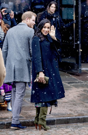 Meghan Markle porte des bottes kaki, et un manteau noir © PPE Nieboer SIPA