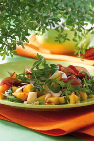 Voir la recette de la salade de roquette aux pêches, bressaola et provolone