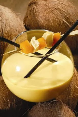 Voir la recette du cocktail coco, mangue, passion et guimauve.