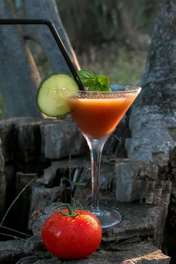 Qui dit cocktail ne dit pas forcément fruits ! A base de tomate, de concombre, de basilic et de sel céléri, ce cocktail est à la fois rafraîchissant et bon pour la santé.