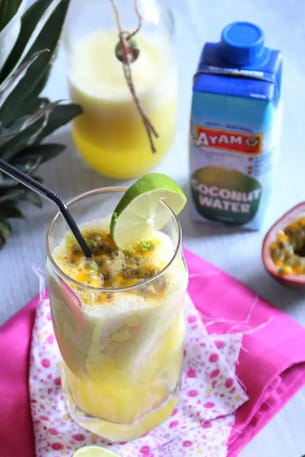 Très à la mode depuis quelques années, l'eau de coco se trouve dans les noix de coco vertes. Elle est associée dans cette recette à l'ananas, au citron vert et aux fruits de la passion.