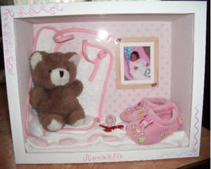 L'idée de cette vitrine est venue à Pascale alors qu'elle feuilletait un livre. Les parents, "très surpris", ont trouvé le cadeau "original et sympa", selon elle, car personnalisé grâce au prénom du bébé et à la photo de celui-ci disposée dans le petit cadre.