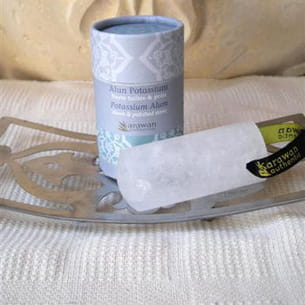 La pierre d'alun est un minéral naturel connue pour son action régulatrice. Elle neutralise les odeurs de transpiration, favorise la cicatrisation de petites coupures et apaise le feu du rasoir. Contrairement aux déodorants et anti-transpirants classiques, elle est hypoallergénique, sans oxyde d'aluminium et sans ammonium. Un atout beauté pour un corps tout doux. La pierre d'alun proposée ici est vendue traversée d'un joli ruban et contenue dans un bel écrin cartonné.