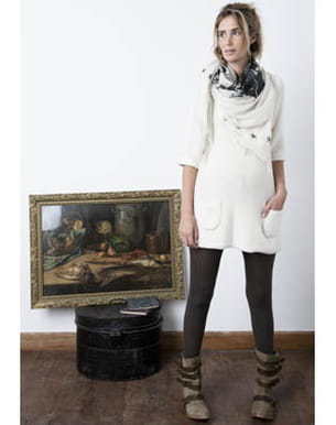 Cette robe en maille blanche est idéale pour l'hiver. Ici, elle est portée avec une paire de collants de grossesse opaques (bien plus confortables !). Pour parachever la tenue, le modèle porte un foulard en laine avec une batterie rock.