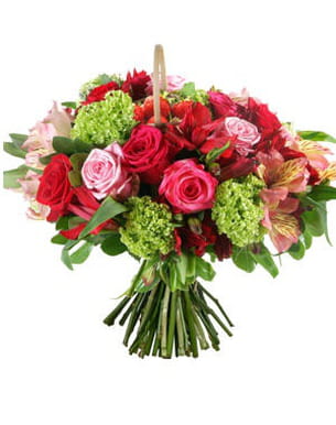Un bouquet de fleurs, c'est une valeur sûre pour la fête des Mères. Pourquoi ne pas y associer une petite touche d'originalité, afin que le tout flatte pupilles et... papilles ? Ce bouquet associe le parfum des fraises aux couleurs des roses rouges et roses. Il est composé de roses "Miss Paris", "Tenga Venga" et "Dékora" auxquelles viennent s'ajouter des alstromerias roses, quelques branches de boules de neige et de pittosporum "nigra". Petite surprise gourmande, la composition cache donc en son coeur un petit panier rempli d'une sélection de fraises françaises Gariguette et Charlotte.
