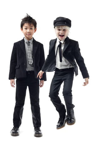Au top des tendances, le petit garçon de gauche porte une veste en velours noir sur une chemise pied de poule, un pantalon en velours et une belle cravate alliant pied de poule et un détail en cuir. Il ne passera pas inaperçu !