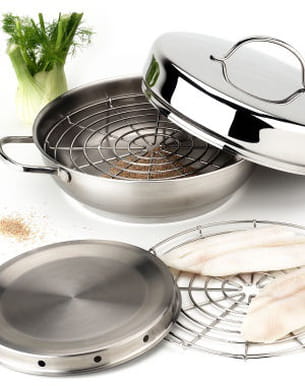 Poisson, viandes, fruits de mer, volailles : vous pourrez fumer tous les aliments grâce à ce fumoir constitué d'une poêle (28 cm) et d'une chambre de fumage. Polyvalent, il vous permettra aussi de cuire à la vapeur vos légumes puisqu'une grille prévue à cet effet est fournie. Pratique, il convient à tous les types de feu, induction incluse.