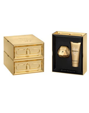 Pour les fêtes de fin d'année, offrez un parfum floral boisé ! Dans ce coffret, spécialement conçu pour Noël 2010, Paco Rabanne propose l'eau de toilette Lady Million, le lait corporel et le gel douche assortis. Le tout est présenté dans un boîtier en forme de lingot d'or. Un cadeau scintillant  !