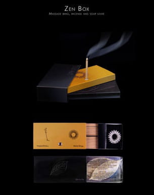 Conçue par Delatour Design, la Zen Box est un objet à la fois pratique et chic. Il comprend un ensemble Happystick avec encens aux huiles essentielles et leur support, une bague automassante Relax Ring et un kit de feuilles de savon parfumé, le tout dans un étui en cuir des plus luxueux.