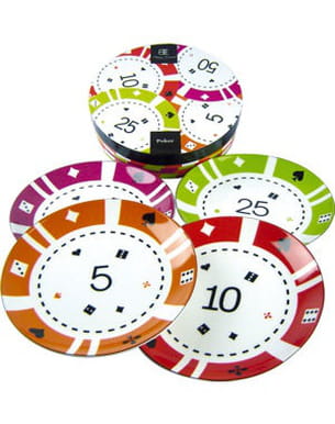 Pour les fans de poker, ce coffret s'impose. Originales, les assiettes s'inspirent des cartes de jeu. Bon c'est vrai, on ne joue pas avec la nourriture mais au moins avec ces modèles, vous pourrez vous mettre en appétit pour une partie après le dessert.
