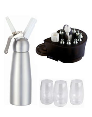 Vous aussi, vous rêvez de réaliser des chantillys et mousses sans aucune difficulté ? Ne cherchez plus, faites-vous offrir ce coffret. Celui-ci contient un siphon pour des préparations chaudes et froides, 3 verrines double paroi, un livre de recettes et un rangement spécialement étudié pour faire sécher votre siphon et éviter les mauvaises odeurs...