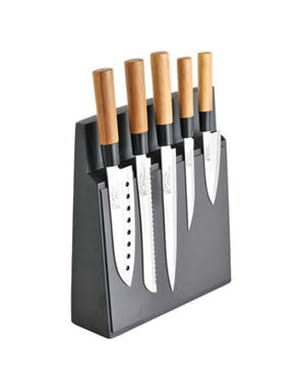 Qui dit Grande Cuisine dit ustensiles haut de gamme ! Aimantés sur un présentoir en acier, voici cinq couteaux qui vous prêteront main forte au fil de vos recettes. Finis d'un manche en bambou, cet ensemble couteaux fera impression dans votre cuisine.