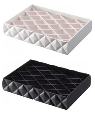 Ces casiers à bagues seront parfaits pour une Maman coquette qui ne sait plus où ranger ses bijoux. Avec leurs contours capitonnés et leurs croisillons internes, ils forment un cadeau à la fois glamour et pratique !