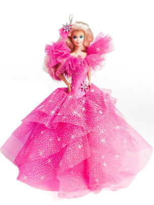 En 1990, Barbie brille de mille feux et s'affiche dans une robe fuchsia étincelante. Le thème des étoiles est repris sur la robe et les accessoires.