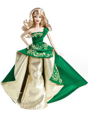 C'est une sublime robe vert émeraude et or que porte Barbie en cette fin d'année 2011. Ses bijoux sont assortis et son rouge à lèvres se fait flamboyant. Détail charme : l'avant de la robe, rebrodé de fils dorés.