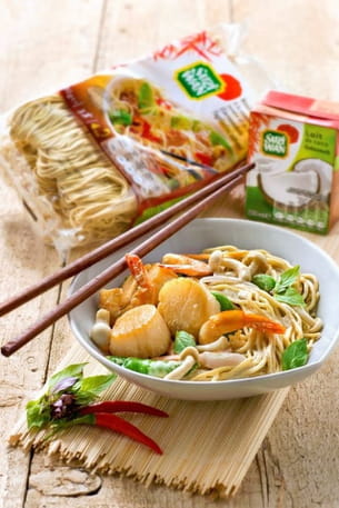 Proposez à vos enfants des saveurs exotiques avec cette recette de nouilles sautées aux crevettes, Saint-Jacques et curry. L'occasion de leur faire manger du poisson, et de leur faire découvrir de nouvelles épices et de nouvelles associations de goûts. En moins de 30 minutes, vous avez un repas équilibré, savoureux et qui va bluffer toute la famille !