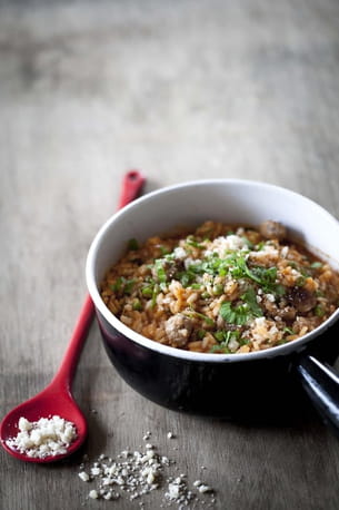 En seulement 30 minutes, réalisez ce risotto au coulis de tomates, à la chair à saucisse et aux petits pois. Voici un plat équilibré, complet et réconfortant !