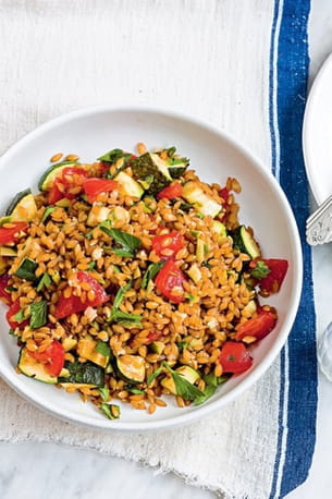 En 30 minutes, réalisez un grand plat complet et équilibré qui se compose d'épeautre pour les protéines et les féculents et de légumes d'été pour les fibres et les vitamines.