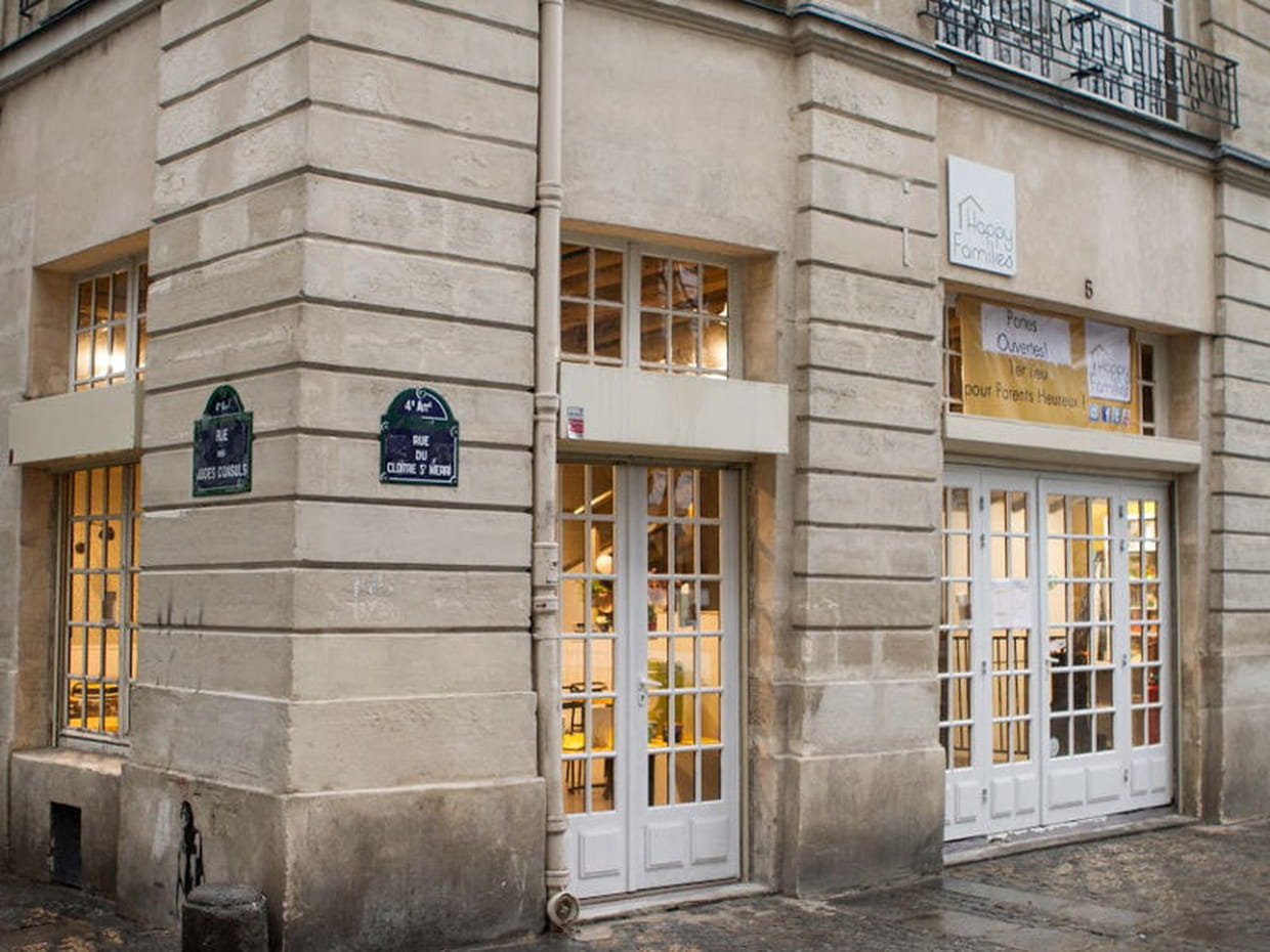 Installé au 5 rue du Cloître Saint Merri, à Paris, Happy Families est un lieu qui accueille parents et enfants pour leur offrir une kyrielle de services. Situé à deux pas de Beaubourg et de l'hôtel de ville, le lieu est chargé d'histoire ! En effet, l'immeuble du XVIIe a d'abord appartenu à l'église Saint-Merri, avant d'être le local du Bacony, lieu dirigé par l'équipe de Canal + où défilaient des stars comme Prince ou Madonna dans les années 80. Le lieu a aussi servi à Bertrand Delanoë pour les élections municipales de 2001.
