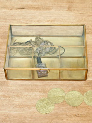 Pour ranger tous les bijoux que vous lui avez offerts depuis la maternelle (dont les fameux colliers de nouilles !), votre maman aura certainement besoin d'un belle boîte. On craque pour ce modèle façon ancienne vitrine d'exposition, en verre et laiton, qui pourra aussi accueillir maquillage et petits objets dans la salle de bains.