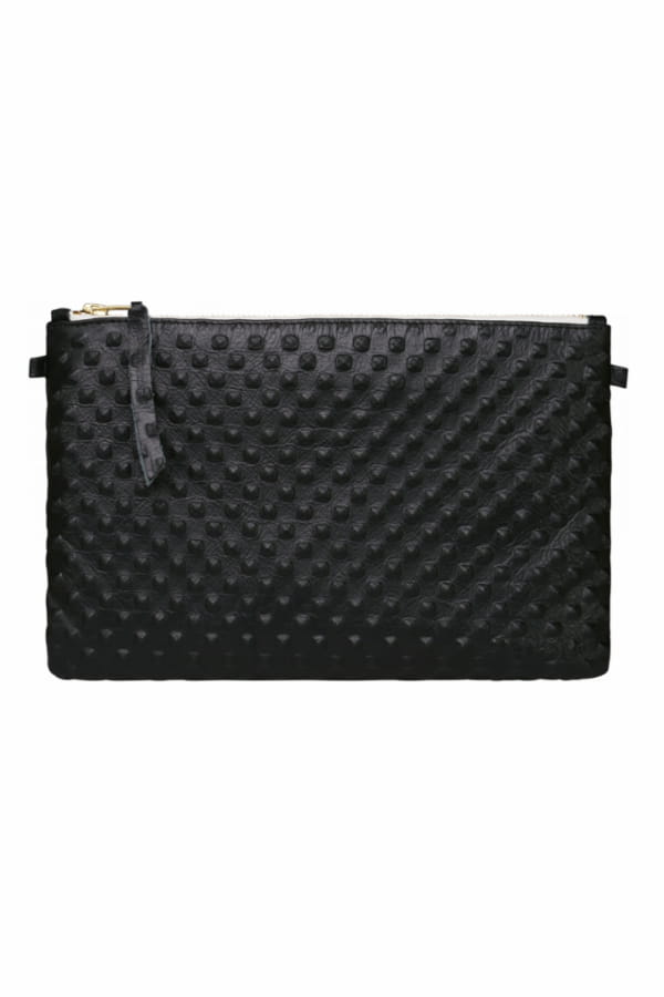Voilà qui sera parfait pour permettre à votre mère d'avoir avec elle son nécéssaire en soirée, tout en étant élégante avec cette pochette en cuir originale et légèrement rock grâce à ces reliefs en forme de clous sous le cuir noir de vachette. Avec ses dimensions de 25x16 cm (modèle XL) elle n'aura pas peur d'être trop limité niveau place.
