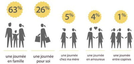 Selon une étude Opinion way réalisée pour Groupon auprès de 600 mères d'enfants de moins de 16 ans, plus d'un tiers des mamans accordent une importance à la fête des mères, particulièrement les femmes de moins de 35 ans (42 %) et ayant des bébés de moins de 5 ans (36 %). L'occasion pour elles de recevoir des preuves d'amour de leurs enfants mais surtout de passer une journée en famille (63 %). Par ailleurs, 26% des mamans interrogées profitent de la fête des mères pour prendre du temps pour elles, 5% prévoient de passer cette journée avec leur propre mère, 4% avec leur conjoint et 1% entre copines.