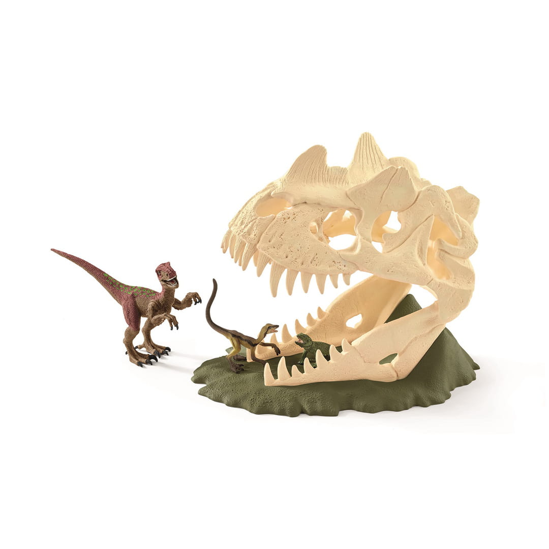 La marque de figurine animalière revient en force avec le vélociraptor vorace qui se cache derrière son piège en forme de crâne. Avec un petit lézard en guise d'appât, le prédateur attrape un compsograthus trop gourmand, piégé par le crâne.