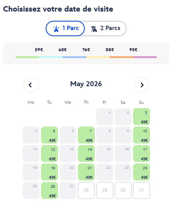 Pour cela, il faut choisir un billet daté, qui ne sera ni échangeable ni remboursable. Les dates étant disponibles entre 60 et 90 jours avant, certaines journées sont encore réservables sur le site de Disneyland Paris. Mais attention : elles risquent de partir vite, car la quantité est limitée ! Pour profiter de cette offre, il faut donc se rendre sur le site officiel et choisir le "billet Bon Plan daté 1 jour", puis sélectionner l'une des dates affichées en vert. À l'heure où nous écrivons ces lignes, il ne reste que deux jours fin avril, mais tous les mardis, jeudis et dimanches du mois de mai sont encore disponibles à ce prix très avantageux. D'autres dates ouvriront plus tard pour les mois suivants.