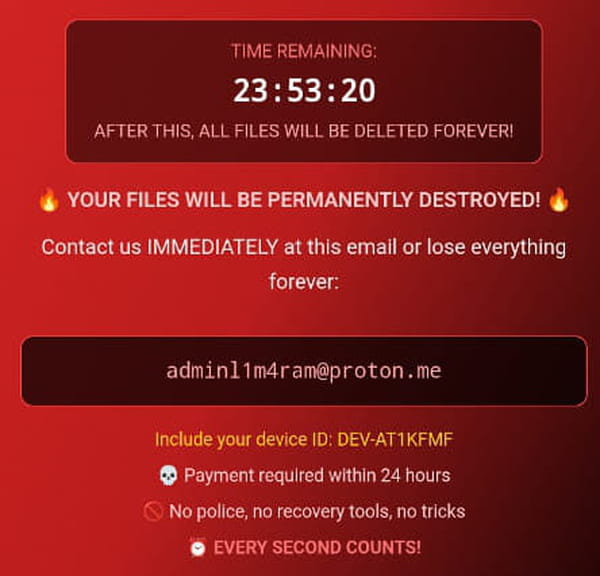 DroidLock peut notamment surveiller les schémas de déverrouillage du téléphone, et changer le code PIN pour que l'utilisateur soit bloqué. C'est alors qu'apparaît un écran rouge menaçant, exigeant une rançon avec un compte à rebours : "Vos fichiers seront définitivement détruits. Contactez-nous immédiatement à cette adresse e-mail ou vous perdrez tout pour toujours. Paiement requis dans les 24 heures. Pas de police, pas d'outils de récupération, pas d'astuces. Chaque seconde compte !"