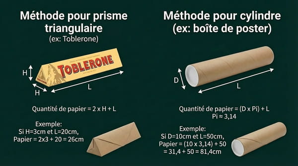 D'autres formules mathématiques peuvent aussi s'appliquer aux objets en forme de prisme triangulaire, à l'instar d'une boîte de Toblerone par exemple, ou encore de cylindre, comme la boîte d'un poster. C'est le moment de voir quels souvenirs vous gardez de vos cours de géométrie… Pour le premier, il s'agit de mesurer la hauteur du triangle puis de la multiplier par deux, et de l'ajouter à la longueur pour obtenir la quantité idéale de papier-cadeau. Pour le second, il faut mesurer le diamètre du cylindre et le multiplier par Pi (environ 3,14). Additionnez ce chiffre à la longueur du tube, et vous obtiendrez les dimensions nécessaires pour votre paquet.