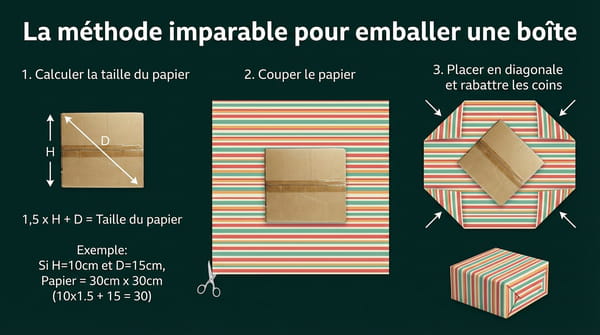 Une chose est sûre, vous n'avez désormais plus d'excuse pour gâcher de grandes quantités de papier-cadeau, ou pour présenter des paquets mal emballés sous votre beau sapin. Et puis, qui sait, cette méthode peut être aussi une approche originale de la géométrie à montrer à vos enfants ! Qui aurait cru que les maths s'inviteraient ainsi dans la confection des cadeaux de Noël ?