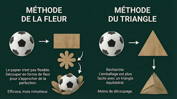 Le défi ultime, c'est le ballon. Car emballer une sphère avec du papier plat est mathématiquement impossible sans plis. L'astuce de pro ? Le découpage en forme… de fleur. Aussi étonnant que cela puisse paraître, créer des pétales à l'image d'une marguerite est l'une des façons les plus efficaces pour emballer ce type de forme. Mais, pour ceux qui n'auraient ni le temps, ni l'envie de se lancer dans un découpage minutieux, des chercheurs ont découvert qu'on pouvait emballer une sphère plus facilement avec une feuille de papier en forme de triangle équilatéral plutôt qu'avec un carré ou un rectangle.