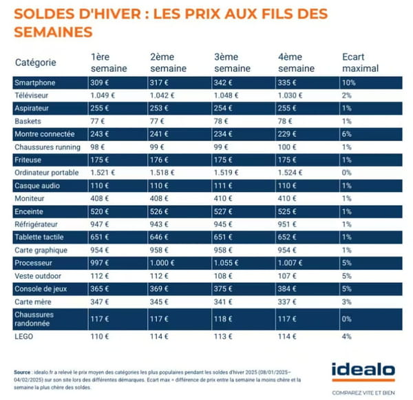 Ces chiffres sont bien sûr à titre indicatif, car il est impossible de prédire à quoi ressembleront les soldes de ce début d'année, qui s'étendront du 7 janvier au 3 février 2026. Tout dépend en effet des catégories de produits, et surtout de la demande. Sur les études précédentes publiées par Idealo, les données varient : en 2023, les prix des smartphones ont baissé tout au long des soldes par exemple, contrairement à 2025 où c'était l'inverse. S'il est impossible de définir le moment absolu pour faire les meilleures affaires, une chose est sûre : l'idée que les prix s'effondrent lors des dernières démarques est souvent une illusion.
