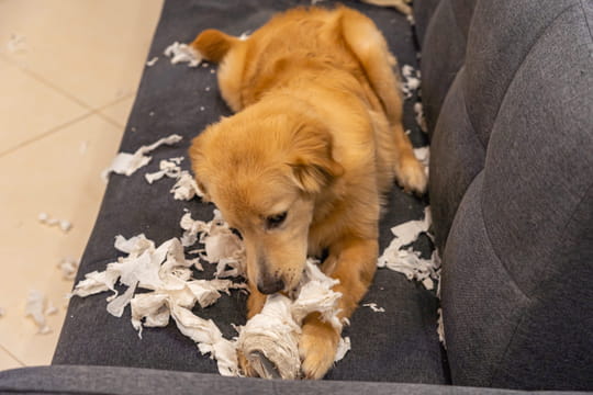 C'est un comportement que tous les propriétaires de chiens redoutent. Aussi adorable soit-il, un toutou qui mordille le canapé, qui déchire les coussins, qui renverse la poubelle, qui mange les chaussures, ou qui arrache les rideaux… C'est un calvaire à supporter pour son maître. Surtout quand cette attitude de destruction continue à l'âge adulte. Car lorsqu'un chiot s'attaque aux meubles, on espère qu'il ne s'agit que d'une phase qui lui passera avec le temps, quand il deviendra plus calme et aura appris à gérer ses excès d'énergie. Pourtant, certains chiens adultes présentent encore ce problème comportemental, et cela n'a rien d'anodin. Indépendamment de sa race – certaines étant plus fougueuses que d'autres par nature – c'est un signe d'un véritable mal-être chez le chien.