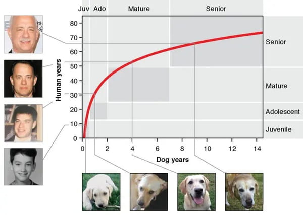 À partir de ces données, les chercheurs ont établi une formule bien plus fidèle que la règle des 7 ans. Ainsi, à l'âge d'un an, un chien correspond plutôt à un humain de 30 ans. Mais ça ne signifie pas qu'il faut multiplier par 30, car à l'âge de 4 ans, un chien équivaut plutôt à un humain de 52 ans, tandis qu'à 12 ans, son stade de vieillissement s'apparente à celui d'un humain de 70 ans. Un calcul qui semble tout à fait logique, comme le souligne le professeur Trey Ideker, auteur principal de l'étude : "Après tout, un chien de neuf mois peut avoir des chiots, donc nous savions déjà que le rapport 1:7 n'était pas une mesure précise de l'âge."