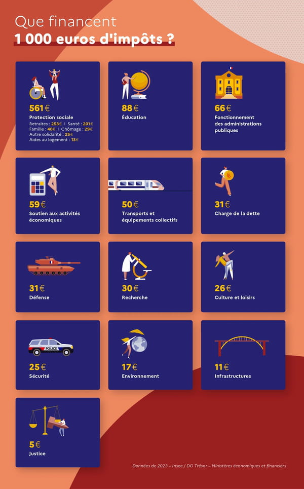 Les données sont celles de l'Insee, datant de 2023 : ainsi, on apprend que pour 1 000 euros d'impôts, plus de la moitié (56 %) est allouée à la protection sociale. Dans le détail, 253 euros vont au système de retraite, 201 euros à la santé, 40 euros à la famille, 29 euros au chômage, 13 euros à l'aide au logement, tandis que les 25 euros restants sont attribués aux autres prestations solidaires. En tout, cela représente donc 561 euros.