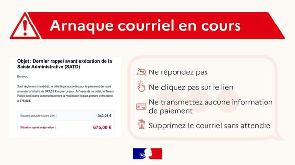 Dans le mail frauduleux signalé par les autorités, l'objet est particulièrement alarmant : "Dernier rappel avant exécution de la Saisie Administrative (SATD)". Cette formulation reprend le vocabulaire de l'administration fiscale pour paraître crédible. Le message évoque une amende forfaitaire de 343,01 euros qui devrait être réglée immédiatement. Les destinataires sont également menacés d'une majoration à 675 euros si le paiement n'est pas effectué dans un délai de 24 heures. Tout est conçu pour donner l'impression d'une procédure officielle et pousser la victime à payer rapidement.