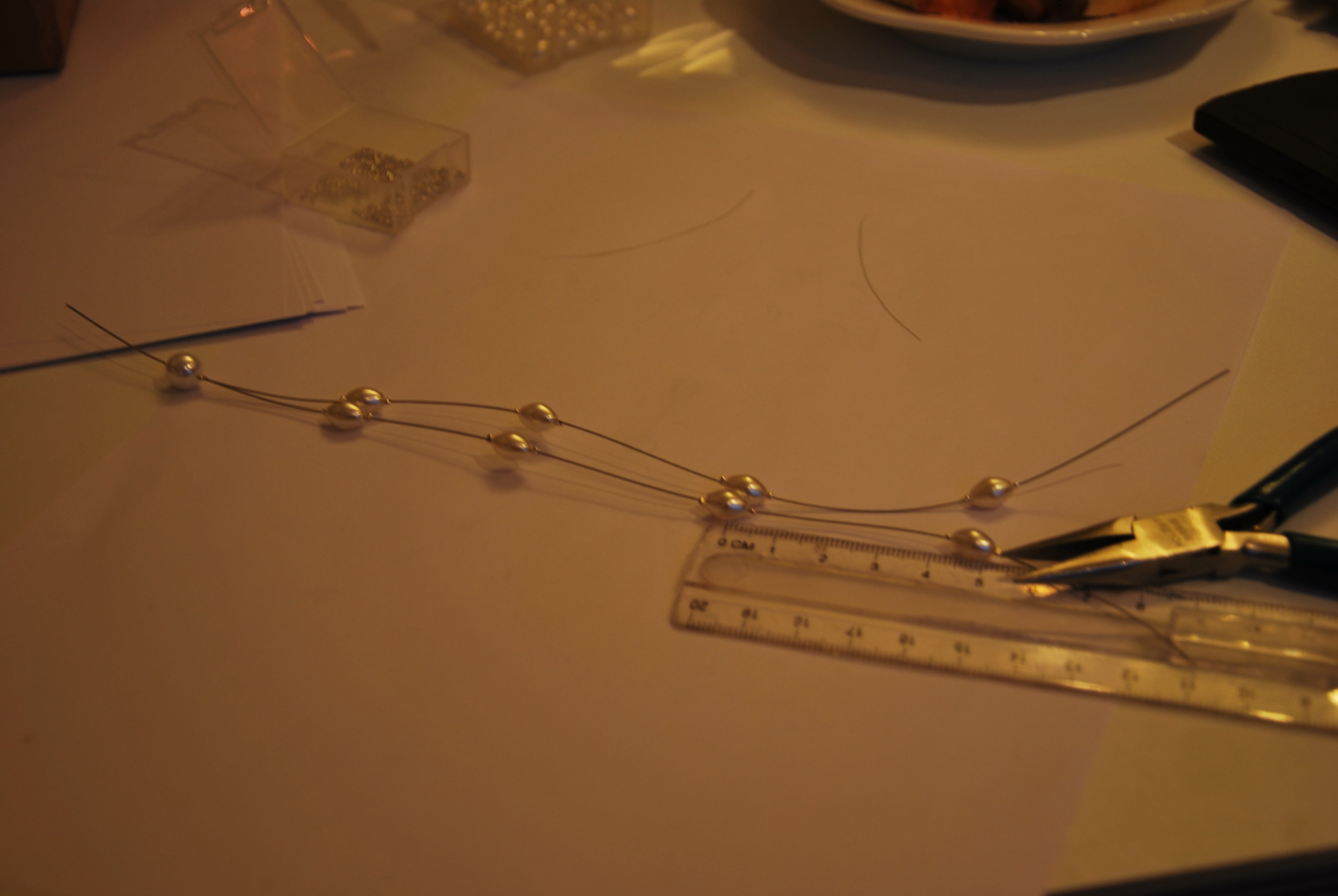 - Pour assembler les autres perles, mesurer avec une règle l'espace depuis la première perle insérée et calculez 4 cm. Insérez alors la première perle à écraser à cette distance. Ensuite, la plus grosse perle suivie de la perle à écraser.