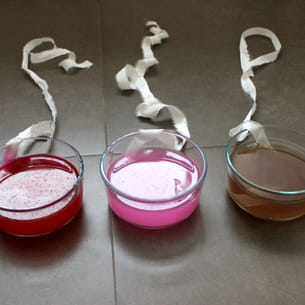 Tremper d'abord 15 cm de chaque bande dans chaque teinture pendant 2 minutes puis le reste de la bande, petit à petit. Répéter cette opération jusqu'à la fin des bandes ou laisser une partie