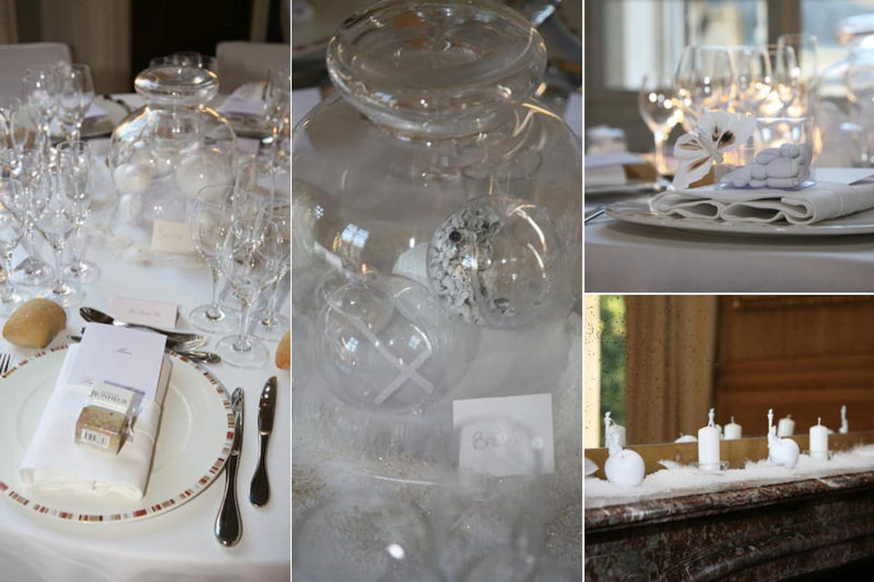 "Dans un esprit féerique, nacré de blanc, l'effet "boule de neige" est indéniable pour ce mariage organisé au Château de Méry-sur-Oise en septembre 2008. Les mariés ont choisi des plumes blanches pour leur duvet, faisant penser au revêtement neigeux, bougies et pommes peintes en blanc (comme si elles avaient été recouvertes de neige). Le centre de table est symbolisé par une cloche transparente sous laquelle on retrouve des petites boules de plastique avec rubans blancs et petits confettis de polystyrène. De la neige artificielle recouvre le tour. Le cadeau d'invité est une petite boîte de dragées blanches rectangulaire et papillon "hivernal"" raconte Alexandra Phelipeau-Mazzoni, wedding-planner pour l'agence Mariage dans l'air. Si vous craquez pour cette déco, parlez-en sur le forum Mariage !