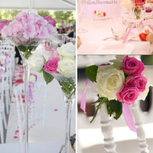 "Pour la cérémonie, des roses fuchsia étaient parsemées le long de l'allée blanche et des bouquets au niveau de chaque allée étaient disposés (les invités pouvaient les emporter facilement en souvenir). Des compositions florales hautes toute en transparence et légèreté étaient également prévues pour la cérémonie et le cocktail.