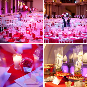"Un pavillon parisien a été choisi comme décor à cette soirée de mariage. Le rouge était à l'honneur, couleur du mariage en Asie. L'alliance a donc été faite entre l'élégance parisienne et la tradition asiatique avec des vases martini en centres de tables, emplis de roses rouges et blanches. La table des mariés se différenciait par une nappe entièrement rouge comparée aux tables des invités "seulement" traversées par un chemin de table rouge. Sur la table, les serviettes des invités sont décorées d'un ruban d'organza rouge et les verres à eau se parent de la même couleur pour harmoniser l'ensemble de la décoration.