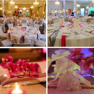Nous avons donc créé un décor dans cet esprit, dans les tonalités de gris perle et de fuchsia. De larges rubans de satin gris sont disposés en biais sur la table pour apporter du graphisme aux tables rondes. Des belles orchidées fuchsia dans un élégant vase argenté, rectangulaire composaient le centre de table. Pour réveiller la couleur grise, nous avons opté pour des verrines transparentes avec de l'eau colorée fuchsia et des bougies flottantes grises.