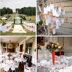 Une cérémonie laïque en extérieur est décorée sur une thématique couleur orangé, chère à la mariée. Tout est assorti ; de l'organza drapant l'allée à l'arche des mariés, en passant par les bouquets en bout de chaise et la décoration florale des pupitres des musiciennes. L'arbre de placement permet aux invités de retrouver leurs places dans les dédales des salons du château. La rose orangée était à l'honneur en centre de table sur des compositions hautes. Des menus calques avec bougie à l'intérieur présentent le déjeuner et des photos des mariés. Chaque serviette est décorée d'un ruban de satin orange pour rappeler le thème couleur de la journée." expliquent Hélène Issautier et Rémi Duclos, wedding-planner de l'agence.