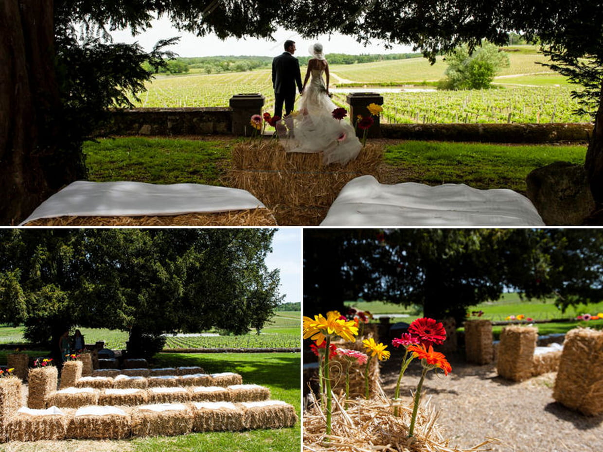 "Voilà un mariage totalement champêtre, qui avait lieu en mai au château Pey-La-Tour, proche de Bordeaux. L'idée est partie du ballot de paille, une cérémonie en plein air sur la paille et pour la note de couleur quoi de mieux que les gerberas !" raconte Elise Gorisse, de l'agence Weday's.