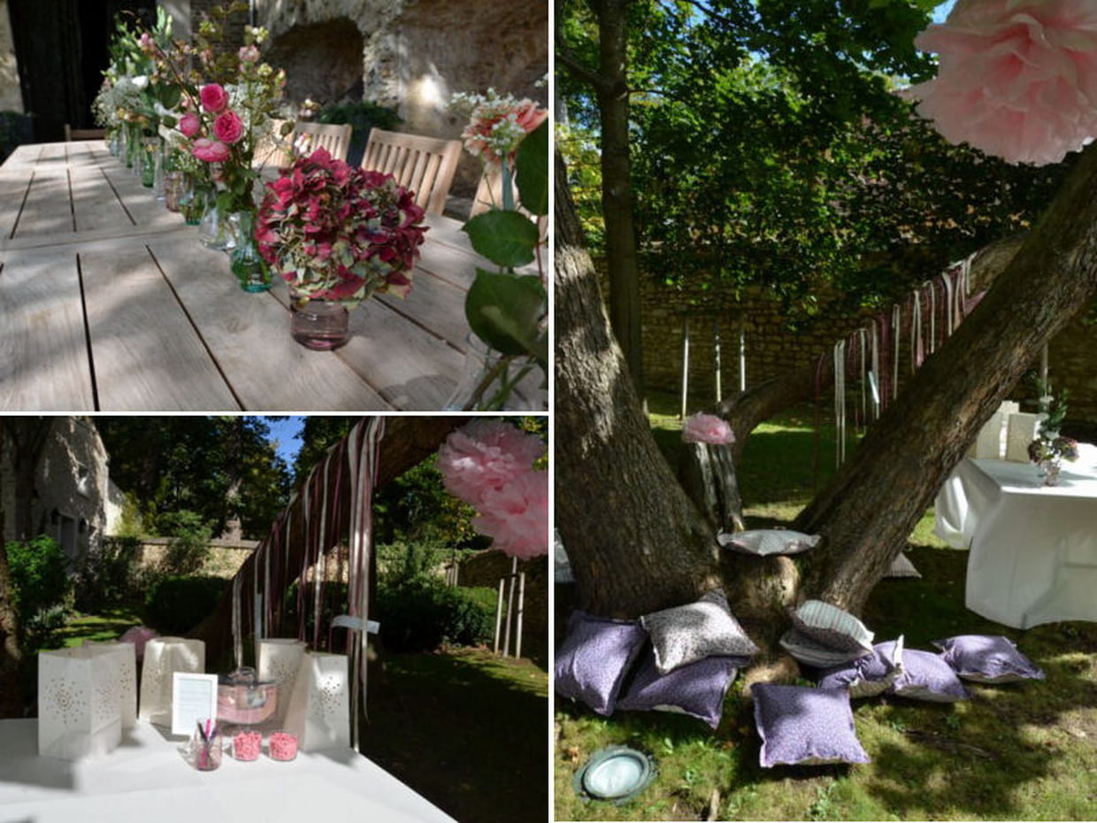 "Ce mariage a eu lieu de jour et en extérieur dans une maison d'hôtes des Yvelines. Le repas n'était pas servi à table mais exclusivement en buffet. Nous avons proposé une ambiance bohème avec plusieurs points de flânerie pour que les invités puissent changer d'environnement tout au long de la journée. Nous avons fleuri toutes les tables et les guéridons de fleurs bohèmes : lisianthus, hortensias... et avons disposé des coussins à côté du transat et de l'arbre à mots pour que les invités puissent s'y détendre." explique Estelle Ernewein, de l'agence Bonnie aime Clyde.