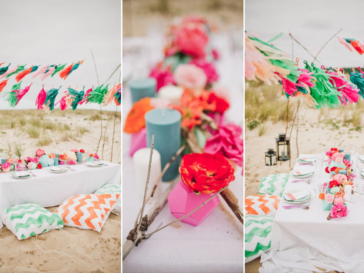 Virginie, de 1,2,3 Nous Irons explique l'esprit dans lequel elle a conçu la table de ce mariage 100% surf : "Une table joliment décorée avec des éléments naturels que nous offre la plage. Vive le bois flotté ! Et des éléments travaillés qui apportent couleurs et modernité. Entre couleurs douces déclinées en milliers de nuances, structures graphiques et éléments naturels, la décoration danse et propose un petit coin de paradis pour un joli moment."